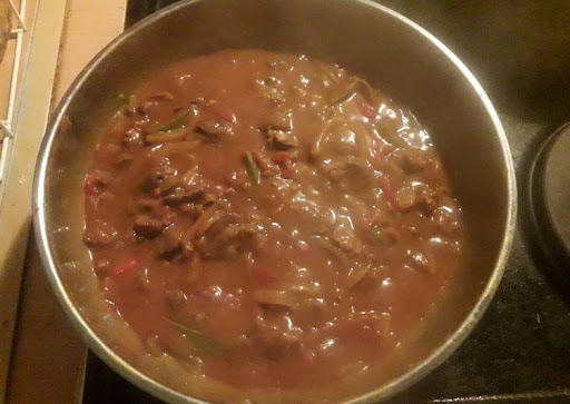 - Add chicken hearts & fry then add peppers & continue stirring.